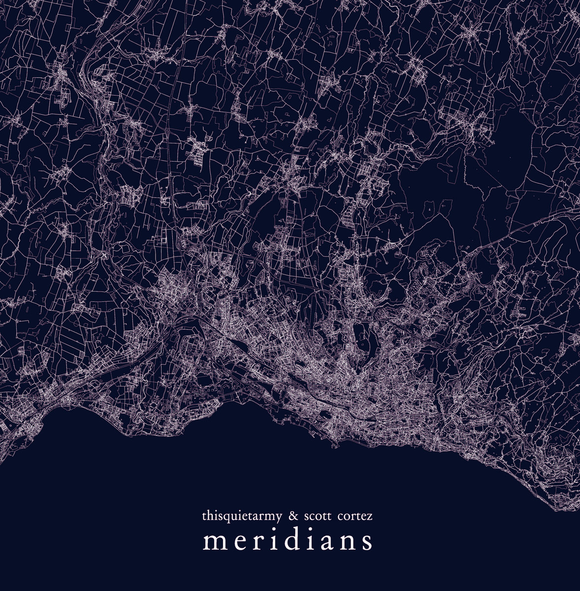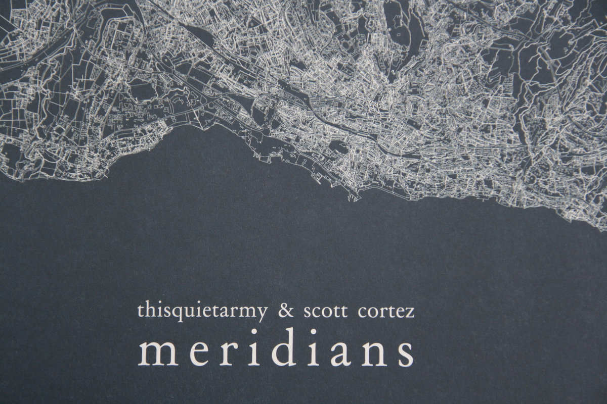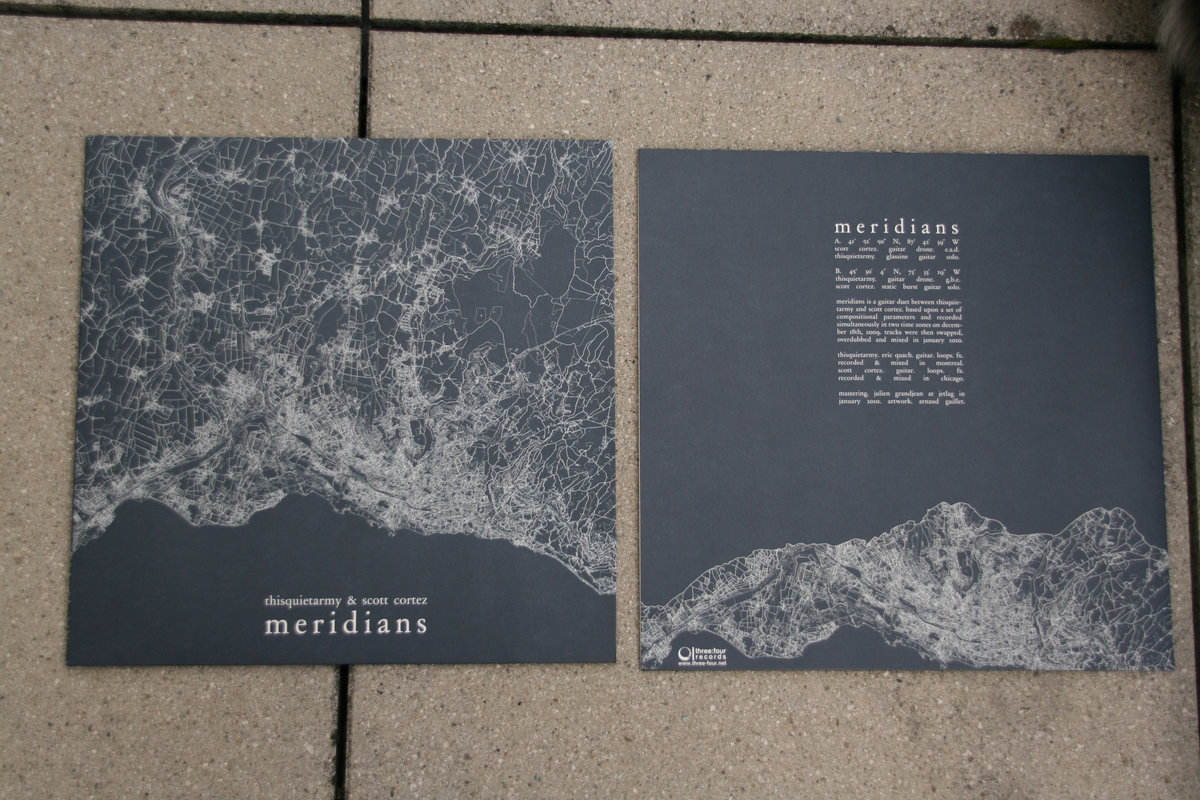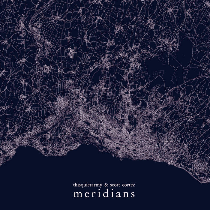 Meridians is a cross-project between the two artists. Separated by 1.000 miles, Eric Quach (thisquietarmy) and Scott Cortez simultaneously began to record the first guitar layer for both sides on December 18th 2009 at 1pm EST. The original drone was supposed to be played like a three tones piece, with the use of a different string for each tone. They then sent the result to each other to work on the piece that the other had begun. This is how they recorded the two tracks that feature on this record.