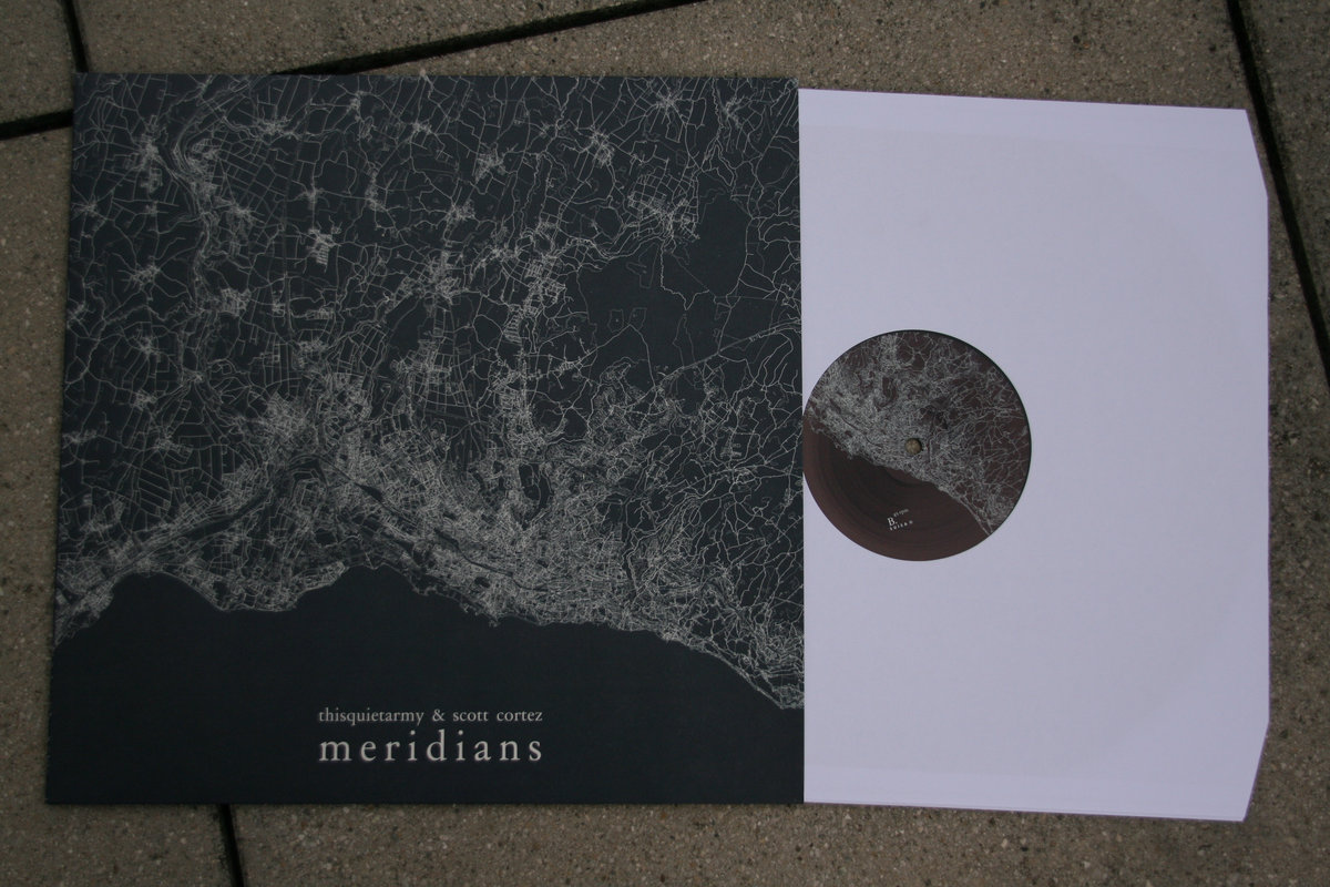 The collaboration between Scott Cortez and thisquietarmy doesn’t really come as a surprise. The latter acknowledges that the previous works from Cortez (under the lovesliescrushing moniker) greatly influenced his work, to the point of using the same way of writing the band’s name (no capital letter and no spaces between words) for his actual solo project. The main thing that they have in common is their unconventional use of the guitar, which they consider as a signal generator. They then process those sounds through various effects, to obtain a different result than that of the original signal until the source becomes almost undetectable. Meridians is also the first vinyl production from thisquietarmy, as it is Scott Cortez’s first under his real name.