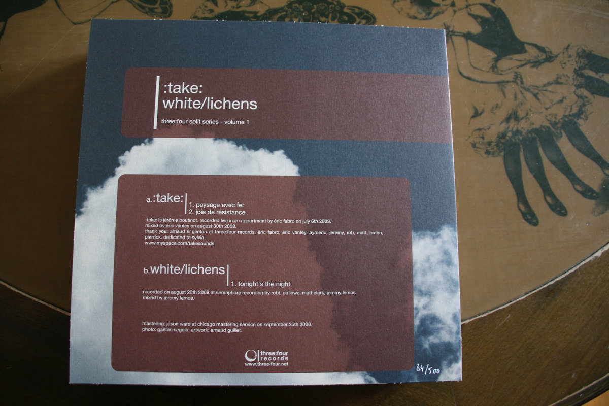 The first volume of the three:four records split series gathers two mesmeric drone guitar lovers, the newly arrived French project :take: coming from Paris and the Chicago based combo White/Lichens. Two different approaches of drone music: soft and melodic for :take:, loud and unbridled for the Chicagoans.